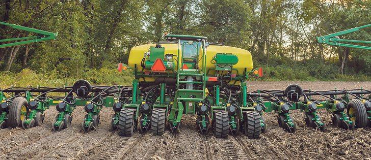 Farmers are finding that it’s bad business to buy a high volume planter if they can’t fill the compartments. Those who have converted to rubber tracks on their planter or the cart on their air drill say it allows them to work that machine to full capacity. They also have smoother fields for spraying and harvest, which Huck said is a factor people often overlook. In addition to compacting the soil, tires also build a ridge or pile of soil along the sides of their indentation. This ridge can stunt the growth of plants seeded there. “One comment we hear from sprayer operators is that when they’re doing fields seeded with tracks, they can hardly tell where the planter went,” he said. “The tracks almost completely disappear, which is easy to see because one track has a surface that’s about five times bigger than one tire.” Huck said the tracks Soucy designed for Deere have a total gross flat plate of 1,664 sq. inches, while the standard Alliance/Galaxy 11-22.5 12PR tires for the planter have a total gross flat plate of 328 sq. inches.