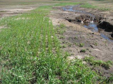 1. Adjust your strategy. Leave residue. Material left on the soil surface is an impediment to water movement. Cover crops or a grass waterway help deflect that water, resulting in more infiltration and less runoff. Gully erosion, a concentrated flow of water that cuts deep channels, is different from other types of erosion because you notice it right away. Other types don’t appear to be a significant problem – yet, looks can be deceiving. Sheet erosion (the uniform removal of soil in thin layers by raindrops and overland flow) and rill erosion (the removal of soil by concentrated water through small channels) are the types that cause the most soil loss.